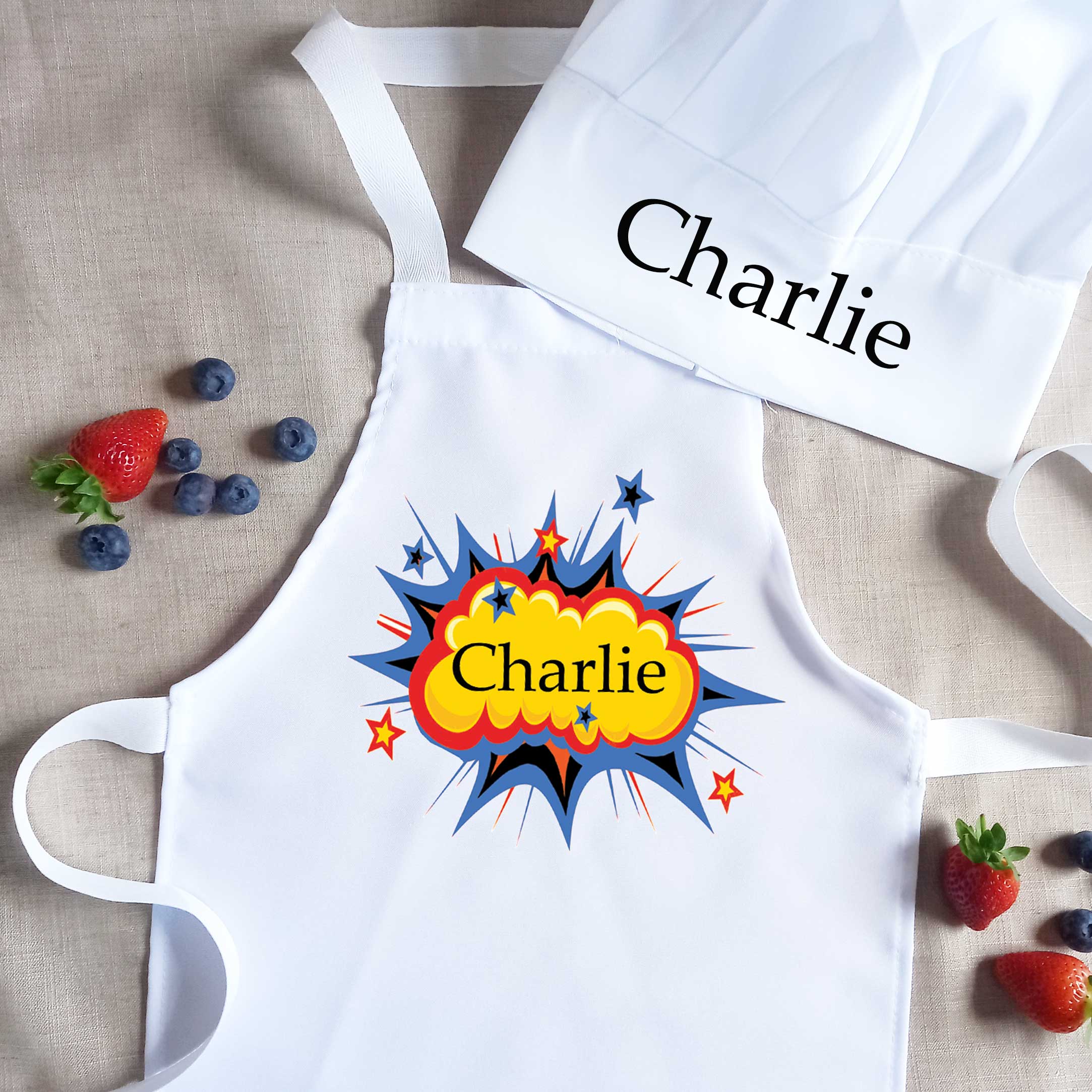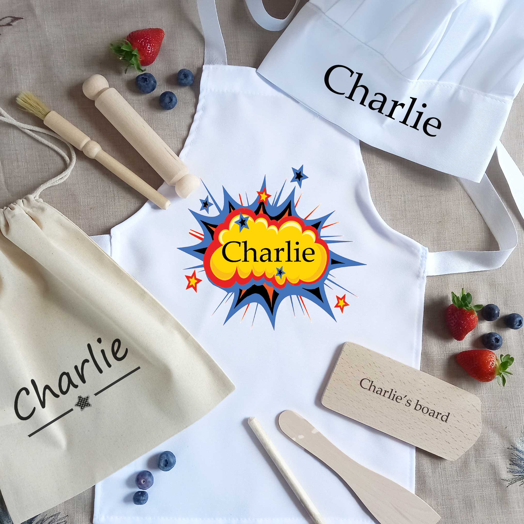 The Boys Apron Kitchen Kit is a great boys’ kitchen gift. Why not add a 5 piece wooden baking set, bag, and hat for a special gift? The Boys Apron Kitchen Kit is a soft white polyester fabric with a tie fastening around the waist. We have designed the artwork for all the aprons so they are unique. The kids’ aprons are machine washable and the print will look great.