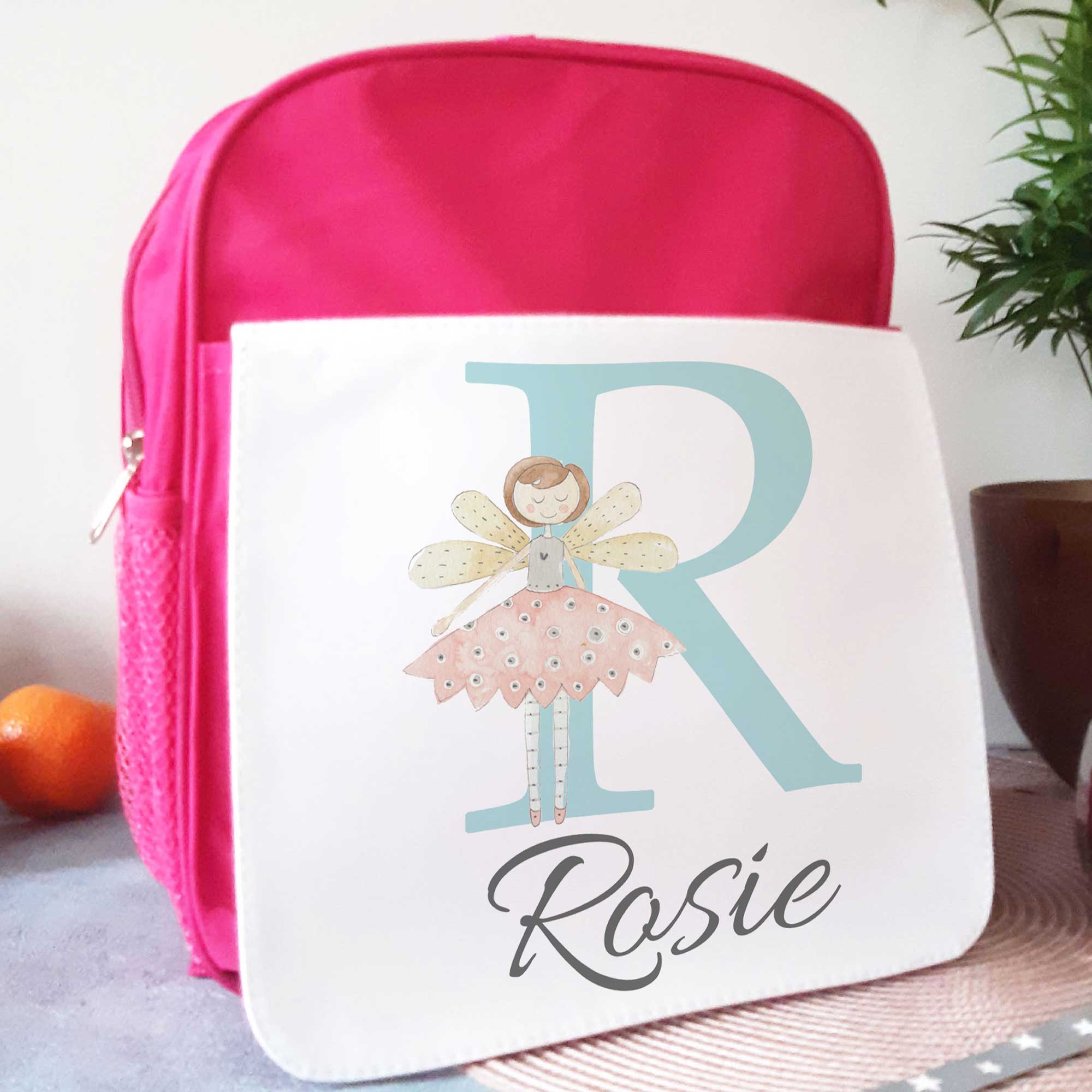 The Fairy Backpack comprises two zipped compartments – one large section and a smaller front pocket. In addition, they have two mesh pockets on either side. The straps are padded and adjustable. The backpacks are 30 cm long and 30 cm wide. Please leave the name box blank if you do not want the bag personalised.