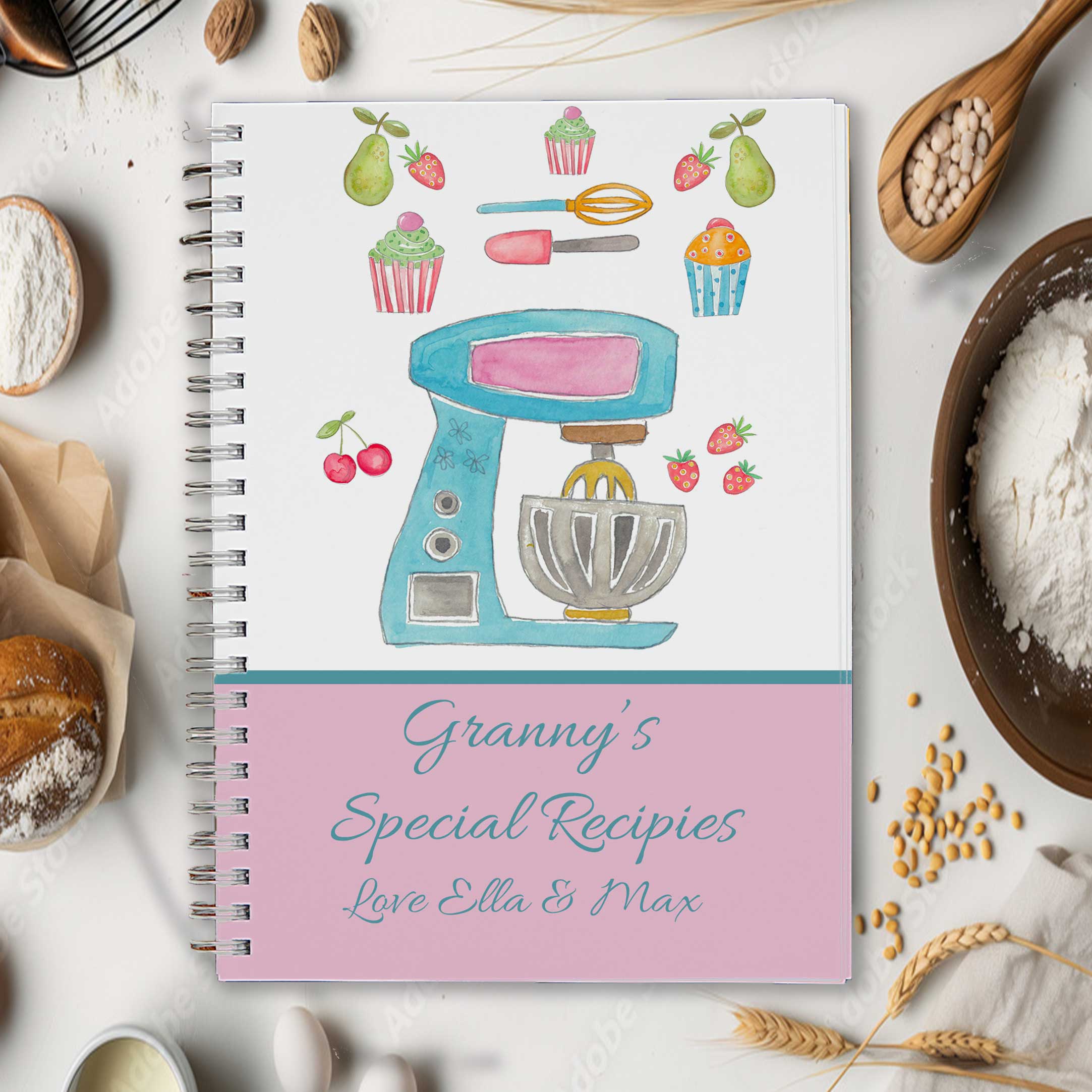 Personalised with any name or message on the cover (e.g. “Mum’s Secret Recipes”, “Granny’s Kitchen Notes”, “[Name]’s Cookbook”)